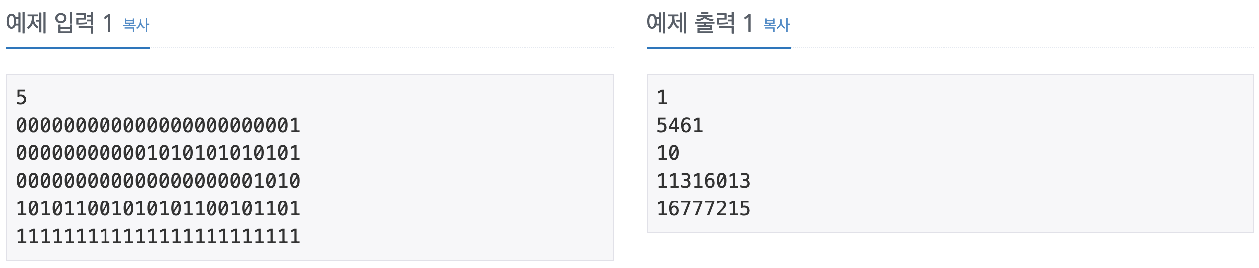 The first line of input gives n ≤ 1000, the number of test cases. Then follow n lines with positive numbers represented as 24-bit binary strings (0s and 1s).