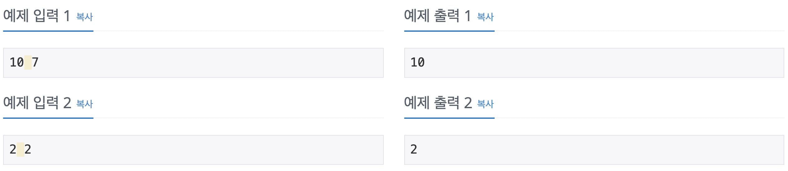두개의 값이 같다면 그 값과 동일한 값을 출력해주고, 다르다면 큰값을 한번 더 출력해주면 되는 문제. ㅇㅅㅇ