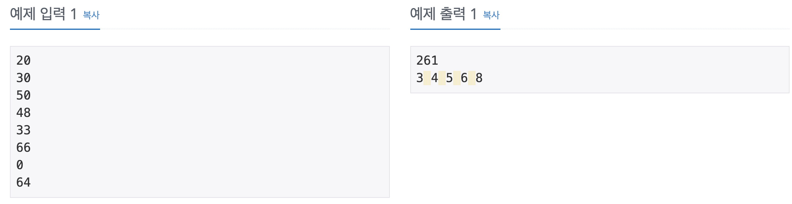첫째 줄에 참가자의 총점을 출력한다. 둘째 줄에는 어떤 문제가 최종 점수에 포함되는지를 공백으로 구분하여 출력한다. 출력은 문제 번호가 증가하는 순서이어야 한다.