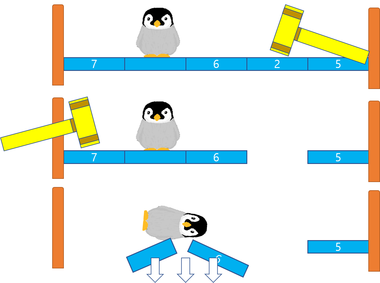 얼음4와 얼음1을 각각 2와 7의 힘을 가해 깨뜨릴 수 있다. 이때, 펭귄이 위치한 얼음2와 얼음3으로 구성된 그룹은 얼음1 또는 얼음5를 포함하지 않으므로 아래로 추락하게 된다. 위 예시에서 펭귄을 떨어뜨릴 수 있는 최소 힘은 2+7=9가 된다.