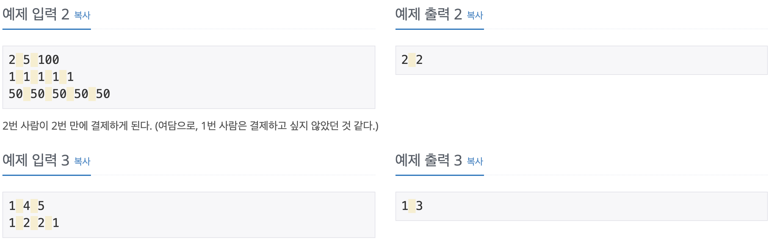 첫째 줄에 결제한 사람이 누구인지, 그 사람이 손을 뻗은 횟수는 몇 번인지를 의미하는 정수를 공백으로 구분하여 출력한다.
