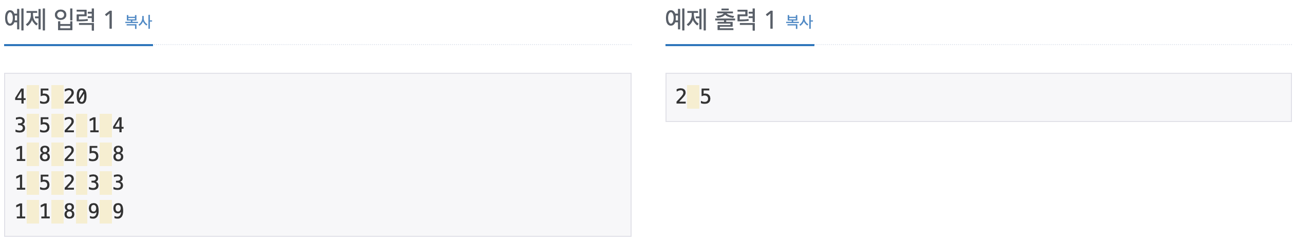 다중배열로 각 번호에 맞게끔 묶어서 입력받은 후, sum배열을 생성해 더해주었다. sum이 K보다 커질때 break와 함께 출력.ㅇㅅㅇ