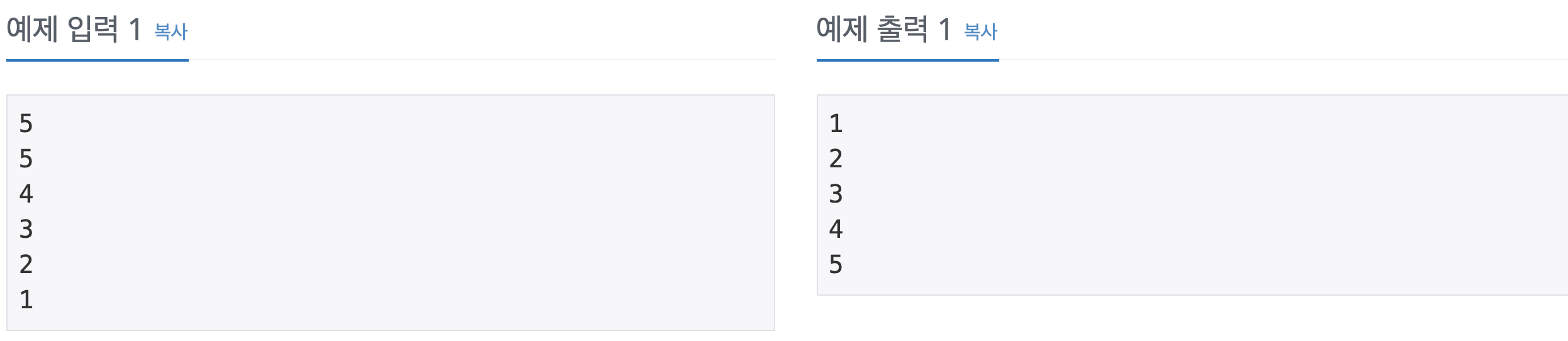 첫째 줄부터 N개의 줄에 오름차순으로 정렬한 결과를 한 줄에 하나씩 출력한다.