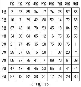 <그림 1>과 같이 9×9 격자판에 쓰여진 81개의 자연수가 주어질 때, 이들 중 최댓값을 찾고 그 최댓값이 몇 행 몇 열에 위치한 수인지 구하는 프로그램을 작성하시오.