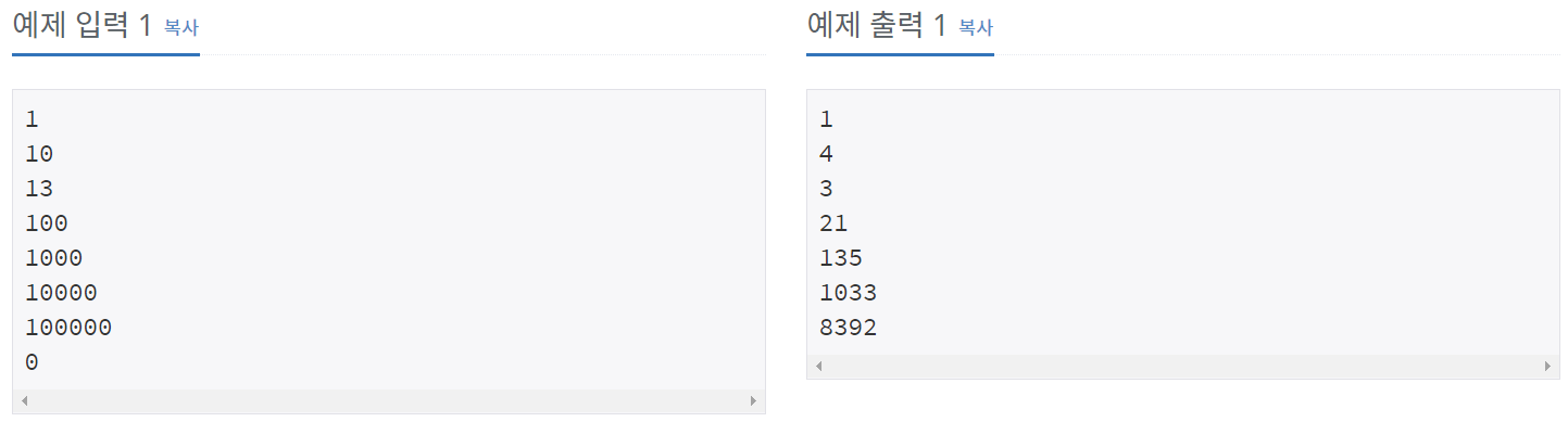 입력은 여러 개의 테스트 케이스로 이루어져 있다. 각 케이스는 n을 포함하며, 한 줄로 이루어져 있다. (n ≤ 123456)