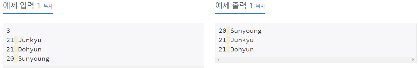첫째 줄부터 총 N개의 줄에 걸쳐 온라인 저지 회원을 나이 순, 나이가 같으면 가입한 순으로 한 줄에 한 명씩 나이와 이름을 공백으로 구분해 출력한다.