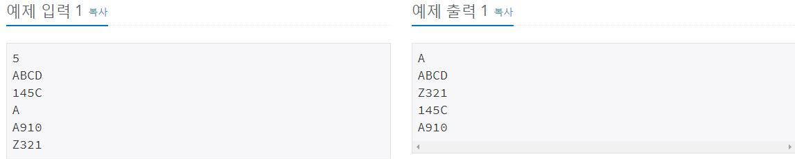 첫째 줄부터 차례대로 N개의 줄에 한줄에 하나씩 시리얼 번호를 정렬한 결과를 출력한다.