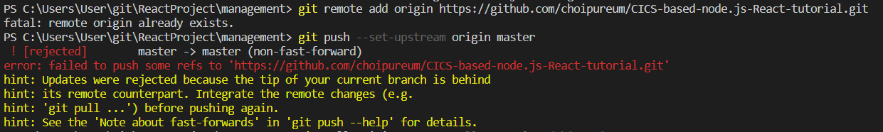github에서 저장소 생성 후 저장소 주소를 remote에 입력(git remote add origin https://github…..)한 뒤, git pull 또는 git merge 명령이 동작하지 않고 git push origin master시 [rejected] master -> master (non-fast-forward) 에러가 발생하는 경우