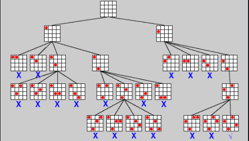 첫 행에 체스말을 배치시켰을 경우 그 다음행에서 배치말이 유효한 칸이 있는지(둘 수 있는 칸인지) 검사 한뒤 없다면 이를 배제하고 그 전 행으로 되돌아간 뒤 , 다음 노드를 검사한다. 만약 최대값이 도출 되지 않는 노드라면 다시 그전전 노드로 돌아가 이 작업을 반복한다. 이렇게 검사하며 최종값이 N이 나오게 된다면 True로 반환한뒤 이 값을 반환하는 방식이다.
