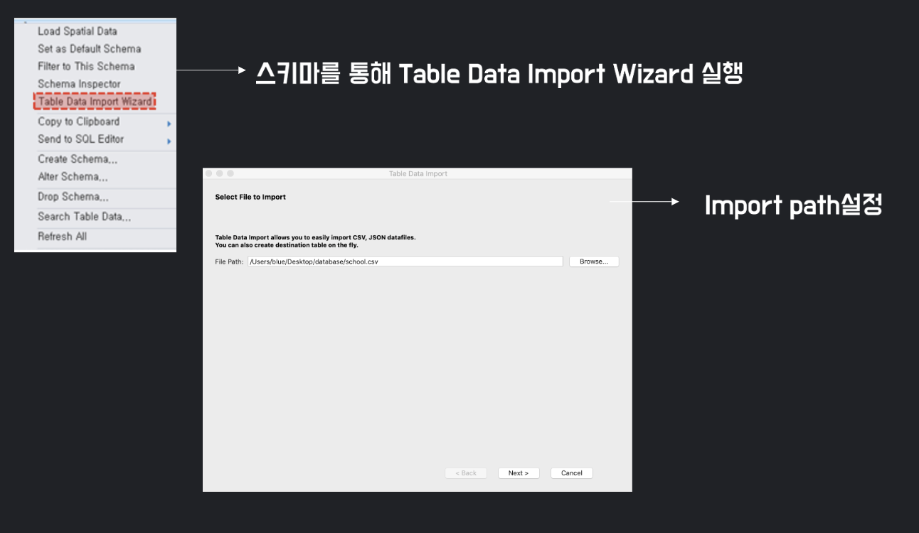 2. Table Data Import Wizard를 클릭 후 경로 설정