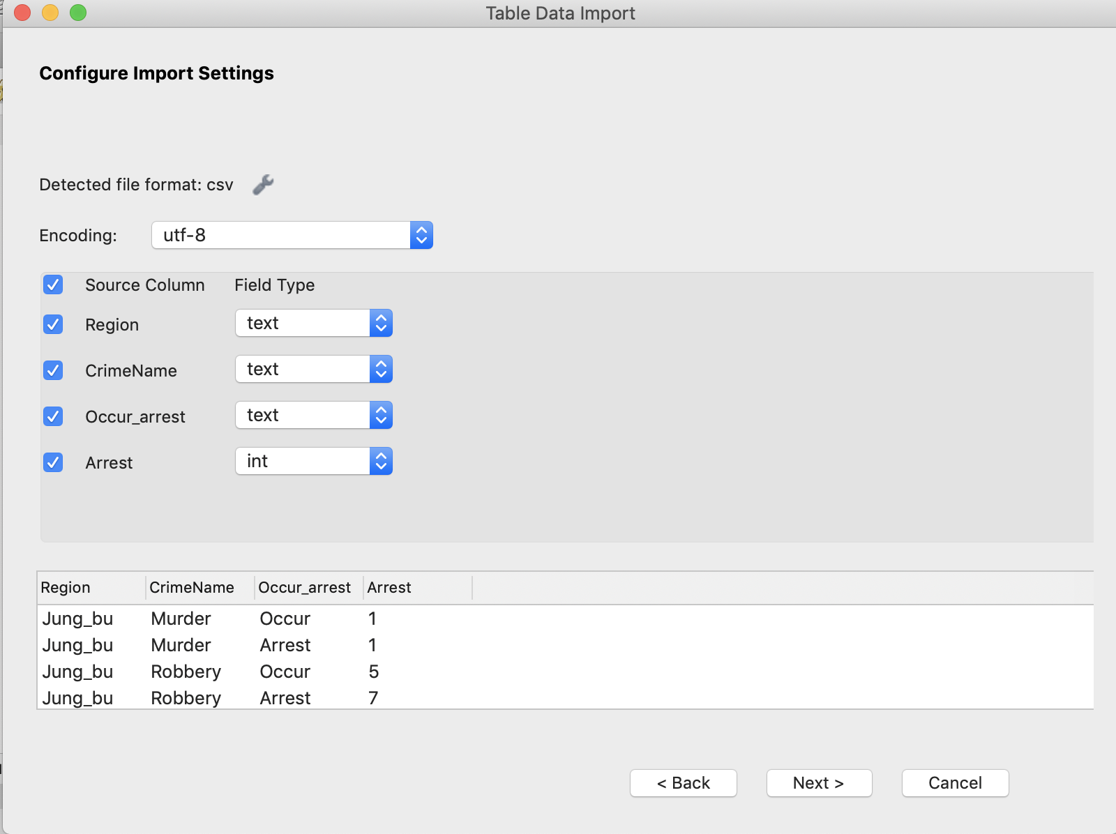 4. 각 Colume 변수의 Type에 따라 Field Type 설정, Encoding은 utf-8로 설정한다.