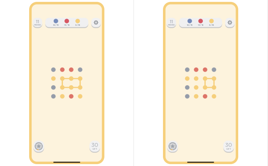 각각의 칸은 색이 칠해진 공이 하나씩 있다. 이 게임의 핵심은 같은 색으로 이루어진 사이클을 찾는 것이다.