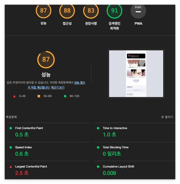 가장 첫 주안점으로 둔 포인트는 TTI(Time to Interactive) 였다. 개인적으로 생각했을 때 유저가 가장 이탈율이 크고 불편하다고 생각하는 부분이 로드 속도 인데, 첫 상호작용이 답답하도록 느리다면 그 앱은 실패했다고 생각하기 때문이다. 이를 위해 리소스 크기를 줄이고 댓글 뷰포트 기반으로 무한스크롤을 적용하고 이미지도 LazyLoad되도록 적용해 주었다. 그리고 렌더 블록 요소를 제거하는 작업을 지속적으로 해주었다(현재 0밀리초). 이외에도 웹 접근성을 고려하여 다음과 같은 요소를 인지하고 100%는 아니어도 최대한 적용해 주었다.