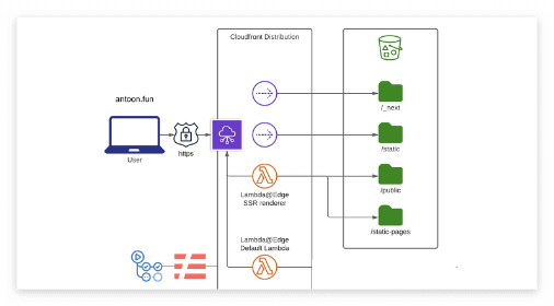 FE 배포는 한번도 경험하지 못했었는데, 팀원의 많은 기여로 아래와 같은 구조가 짜여졌다. Github action으로 dev, staging, live 환경별로 serverless를 통해 배포하고 있다. AWS ClounFront, AWS 람다엣지를 주로 사용한다.
