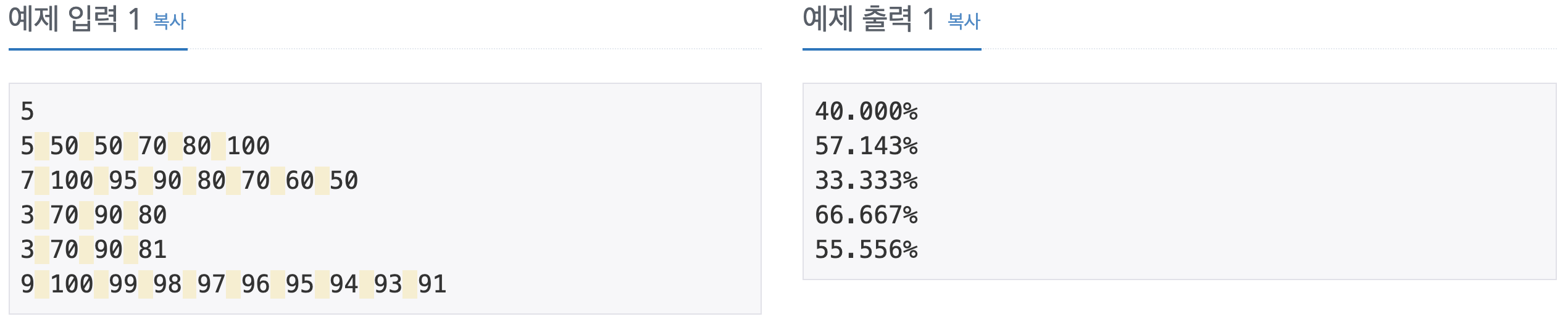 각 케이스마다 한 줄씩 평균을 넘는 학생들의 비율을 반올림하여 소수점 셋째 자리까지 출력한다.