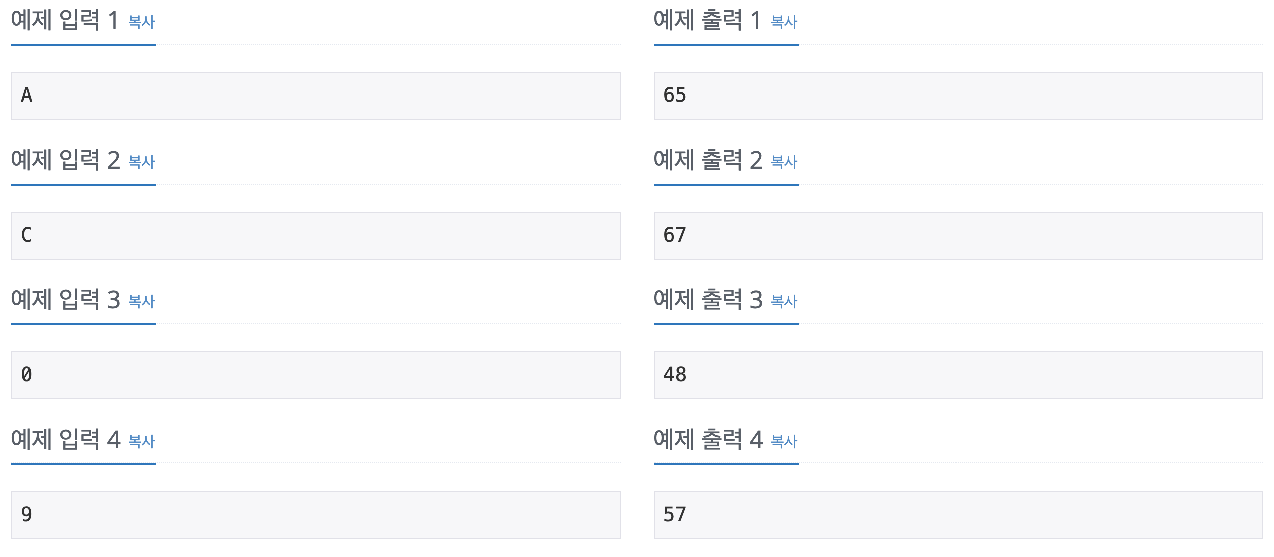 입력으로 주어진 글자의 아스키 코드 값을 출력한다.