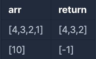 정수를 저장한 배열, arr 에서 가장 작은 수를 제거한 배열을 리턴하는 함수, solution을 완성해주세요. 단, 리턴하려는 배열이 빈 배열인 경우엔 배열에 -1을 채워 리턴하세요. 예를들어 arr이 [4,3,2,1]인 경우는 [4,3,2]를 리턴 하고, [10]면 [-1]을 리턴 합니다.