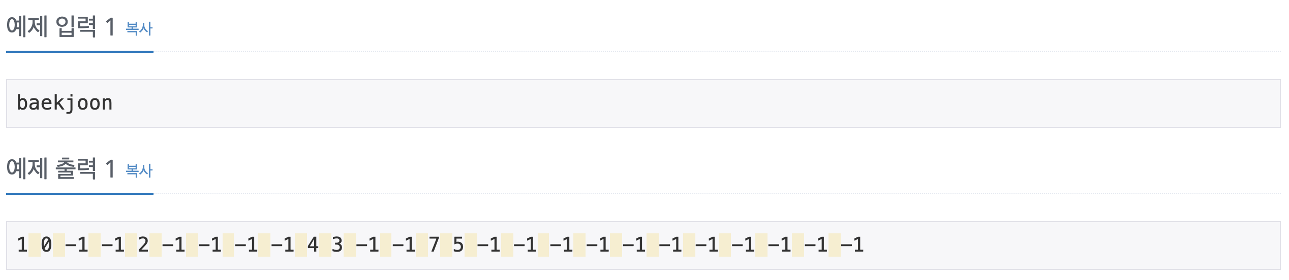 각각의 알파벳에 대해서, a가 처음 등장하는 위치, b가 처음 등장하는 위치, ... z가 처음 등장하는 위치를 공백으로 구분해서 출력한다. 만약, 어떤 알파벳이 단어에 포함되어 있지 않다면 -1을 출력한다. 단어의 첫 번째 글자는 0번째 위치이고, 두 번째 글자는 1번째 위치이다.