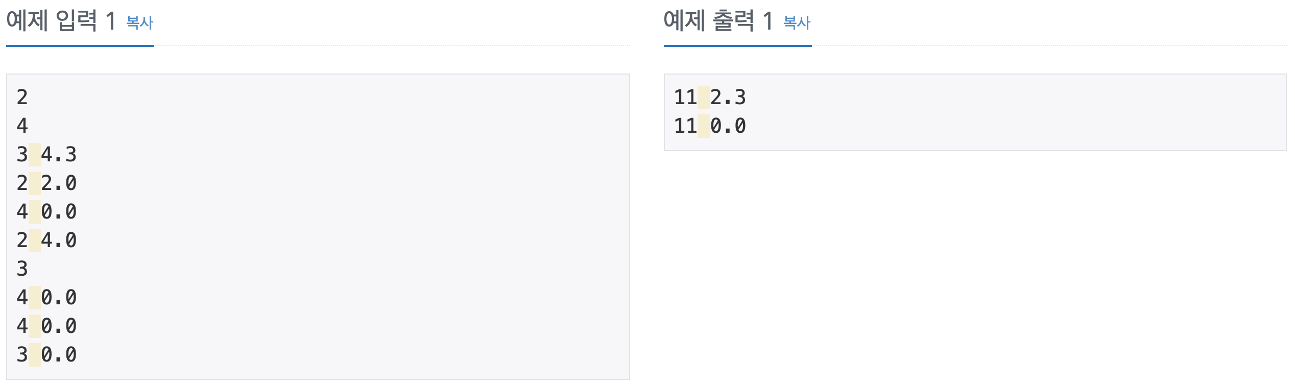 배열을 통해서 풀어보았다. 처음에는 출력에 "정답과의 절대 오차는 10-1까지 허용한다."라는 말을 크게 신경안쓰고 그냥 예제 출력대로 소수점 첫째자리 수까지 표현하면 되겠지...라고 생각했는데 그게 아니다. Math.round() 함수를 통한 반올림을 해야 정답처리로 인정되는 문제이니 주의하길 바란다.(필자는 왜 틀렸는지 몰라서 한참 고민하다가 나중에 출력 문구에 눈을 돌려 확인하고 통과되었다)