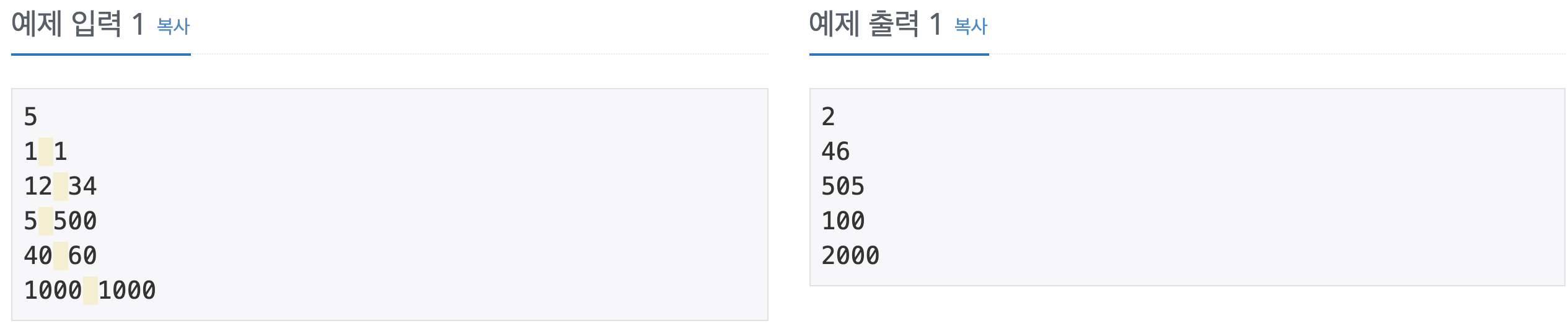 첫 줄에 테스트케이스의 개수 T가 주어진다. T는 최대 1,000,000이다. 다음 T줄에는 각각 두 정수 A와 B가 주어진다. A와 B는 1 이상, 1,000 이하이다.