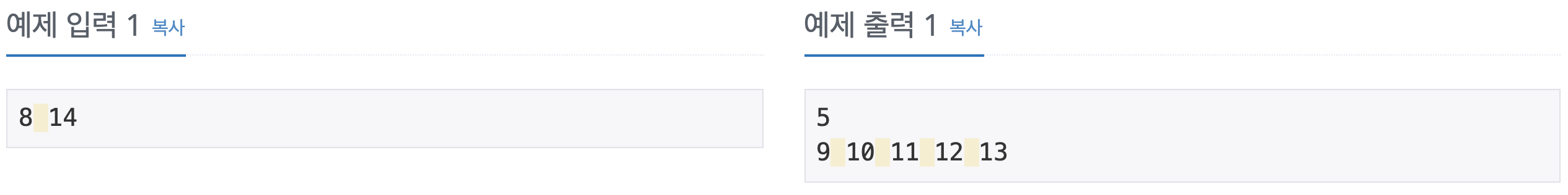 문제 두 양의 정수가 주어졌을 때, 두 수 사이에 있는 정수를 모두 출력하는 프로그램을 작성하시오. 입력 두 정수 A와 B가 주어진다. (1 ≤ A, B ≤ 1015, A와 B의 차이는 최대 100,000) 출력 첫째 줄에 두 수 사이에 있는 수의 개수를 출력한다. 둘째 줄에는 두 수 사이에 있는 수를 오름차순으로 출력한다. 예제 입력 1 복사 8 14 예제 출력 1 복사 5 9 10 11 12 13...