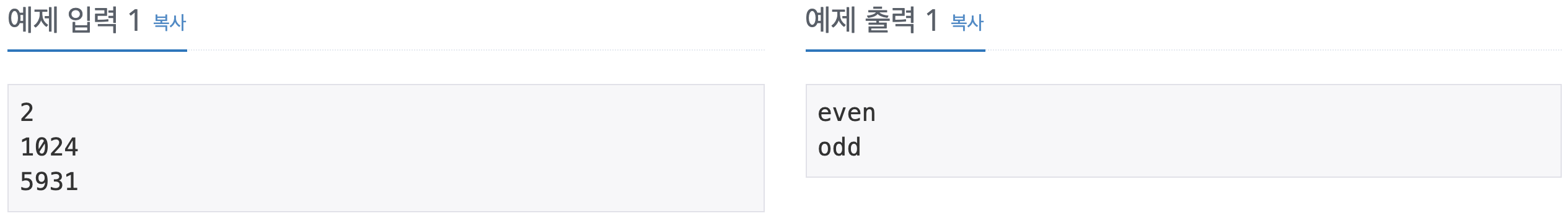 문제 짝이 없는 경재는 매일 홀로 있다보니 홀수를 판별할 수 있는 능력이 생겼다. 창식이는 경재의 말이 사실인지 그 능력을 시험해보려 한다. 창식이의 의심이 끝이 없을 것 같아 N개만 확인하기로 정했다. N개의 정수가 주어지면 홀수인지 짝수인지를 출력하는 프로그램을 만들어 경재의 능력을 검증할 수 있게 도와주자. 입력 첫 번째 줄에 숫자의 개수 N(1 <= N <= 100)이 주어진다. 두 번째 줄부터 N+1번째 줄에 걸쳐 홀수인지 짝수인지 확인할 정수